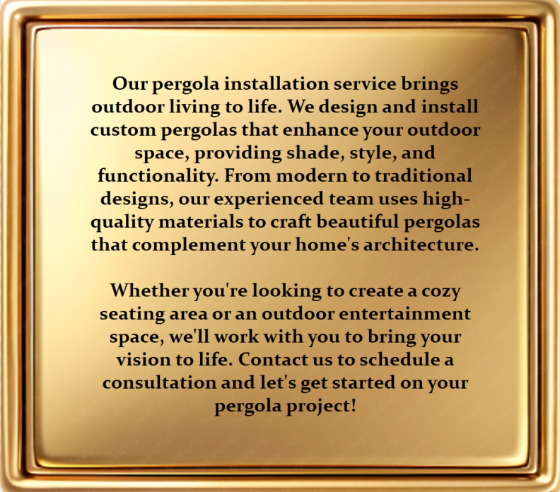 Transform your outdoor living space with our expert pergola installation service. Our team of skilled professionals will design and build a stunning pergola that enhances your home's curb appeal and provides a relaxing shaded area for entertainment and recreation. We use high-quality materials, including durable woods, low-maintenance vinyl, and rustic metals, to ensure your pergola withstands the elements and remains a beautiful focal point for years to come. From classic to modern designs, we'll work closely with you to bring your vision to life.
